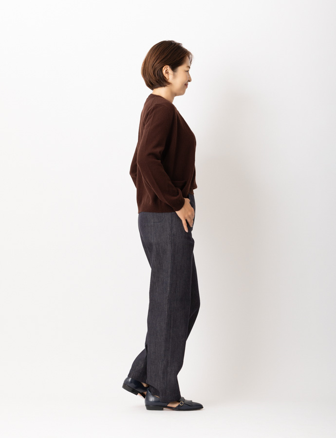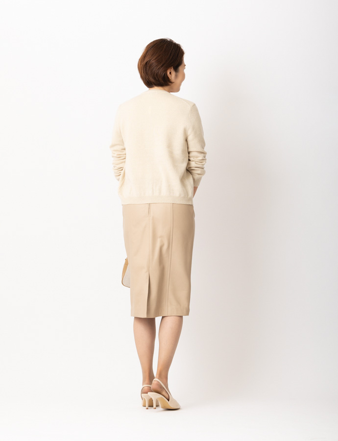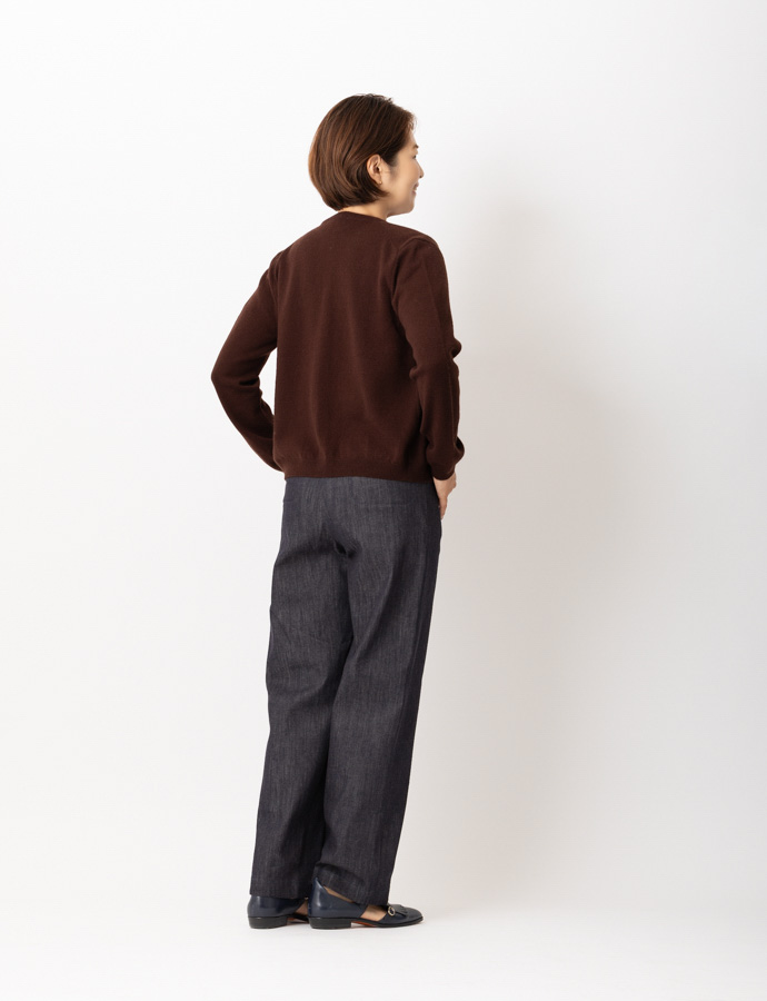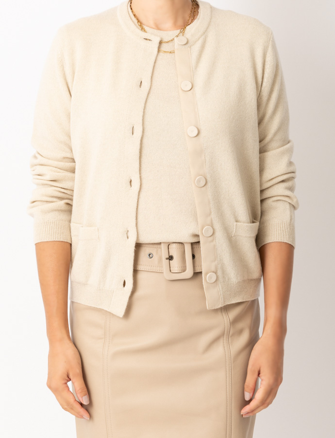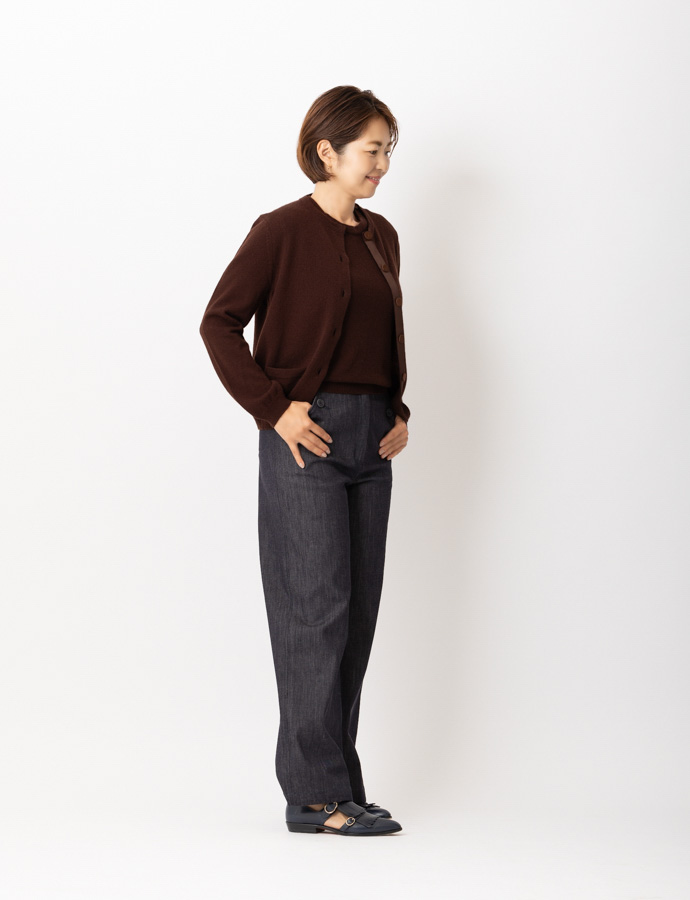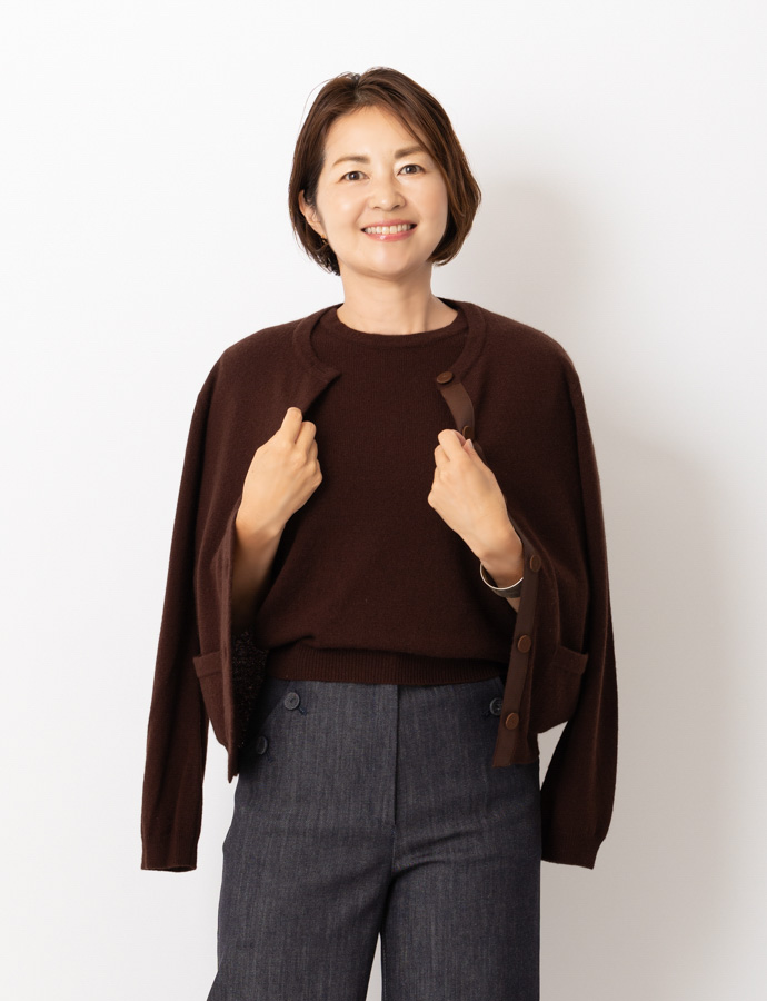 デザインは、グログランをあしらった前立てと、同じ素材で仕上げたくるみボタン、そしてポケットが、ニットをエレガントに格上げするアクセントに。