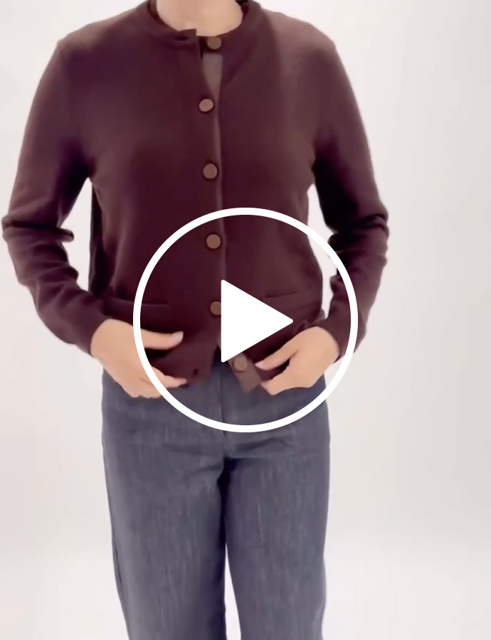 デザインは、グログランをあしらった前立てと、同じ素材で仕上げたくるみボタン、そしてポケットが、ニットをエレガントに格上げするアクセントに。