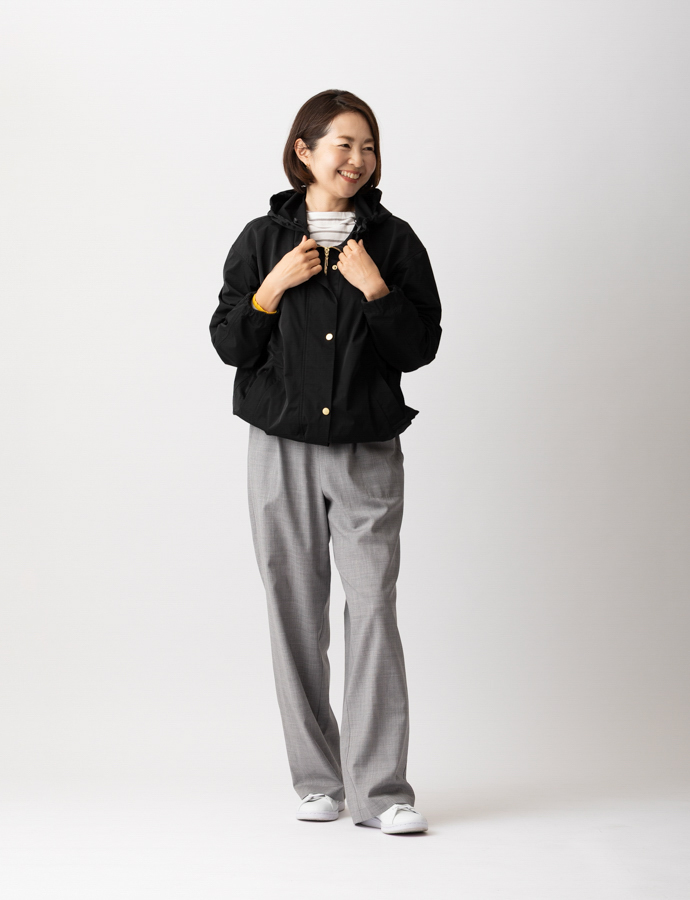 ファスナーやドットボタンにゴールドをあしらうことで、スポーティすぎず、上品でエレガントな印象に。