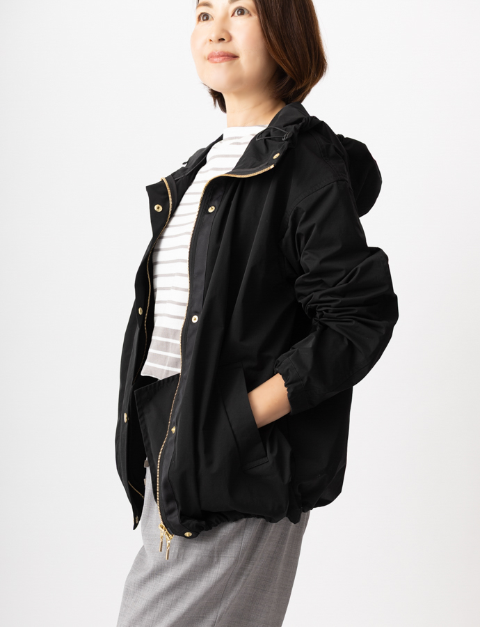 ゴールドづかいで華やかに。撥水性・透湿性のある軽量ブルゾン