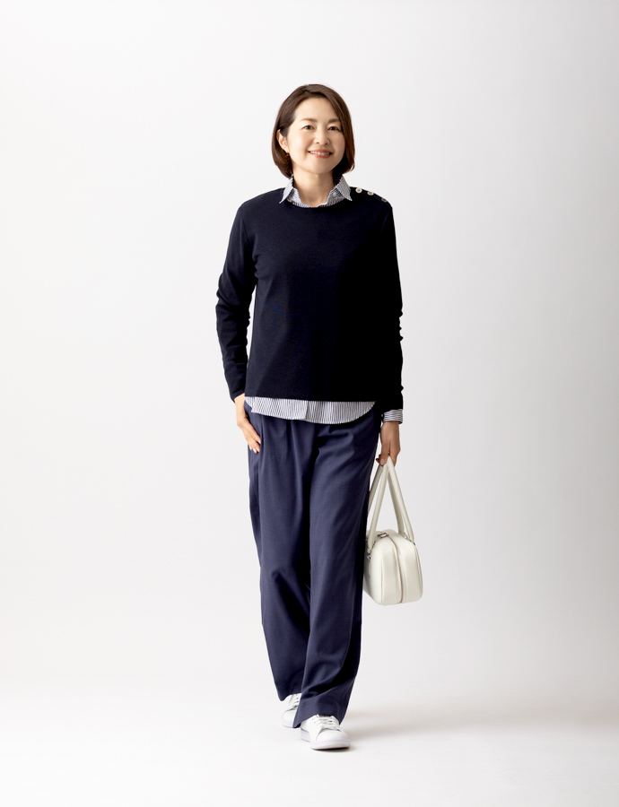 袖口や裾にリブを入れず、すっきりとしたストレートシルエットに仕上げました。